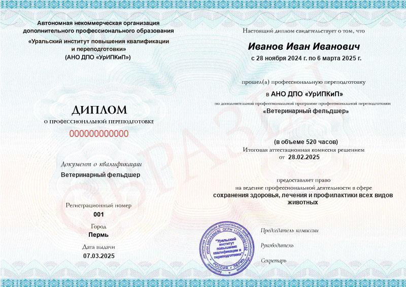Подтверждает вашу квалификацию специалиста среднего звена «Ветеринарный фельдшер». Действует на всей территории РФ.