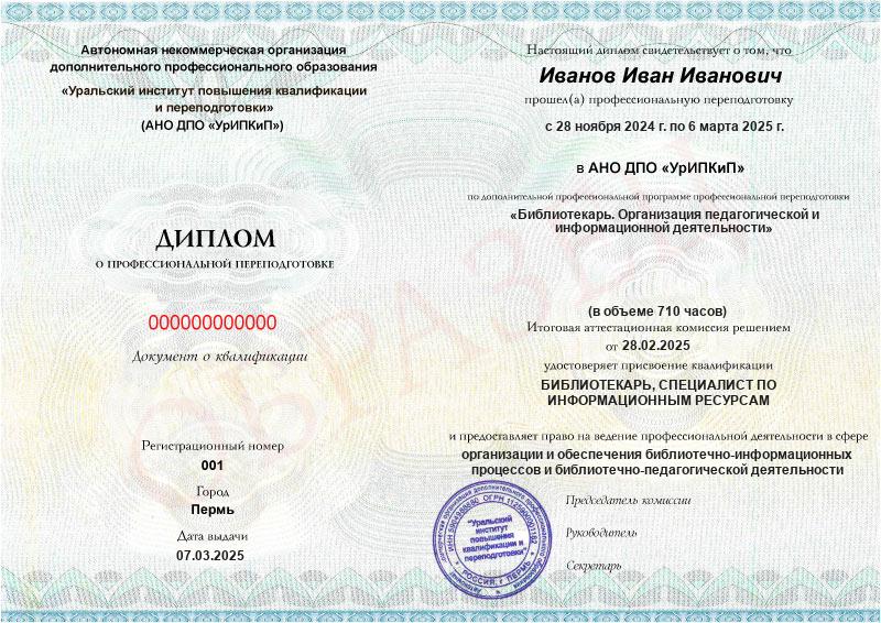 Курс обучения Библиотекарь. Организация педагогической и информационной деятельности (710ч)