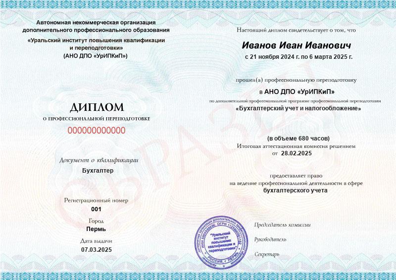 - Образец диплома о профессиональной переподготовке.