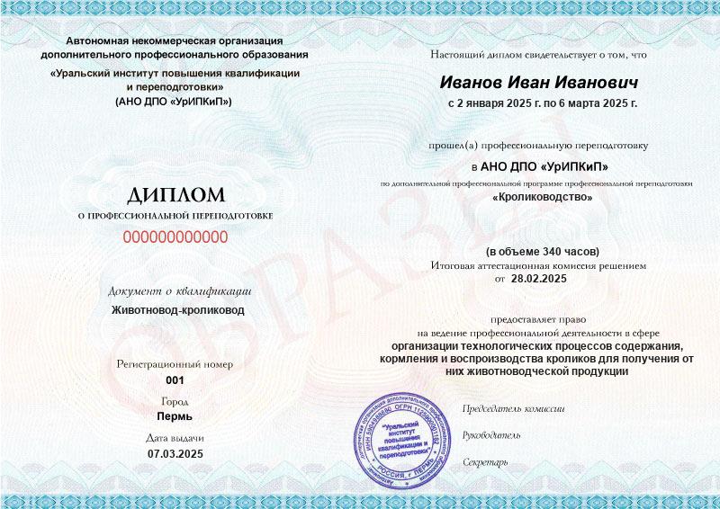 - Диплом о профессиональной переподготовке с присвоением квалификации «Животновод-кроликовод»