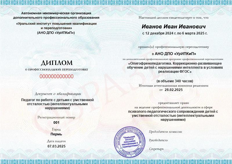 • Квалификация: Педагог по работе с детьми с умственной отсталостью (интеллектуальными нарушениями)
