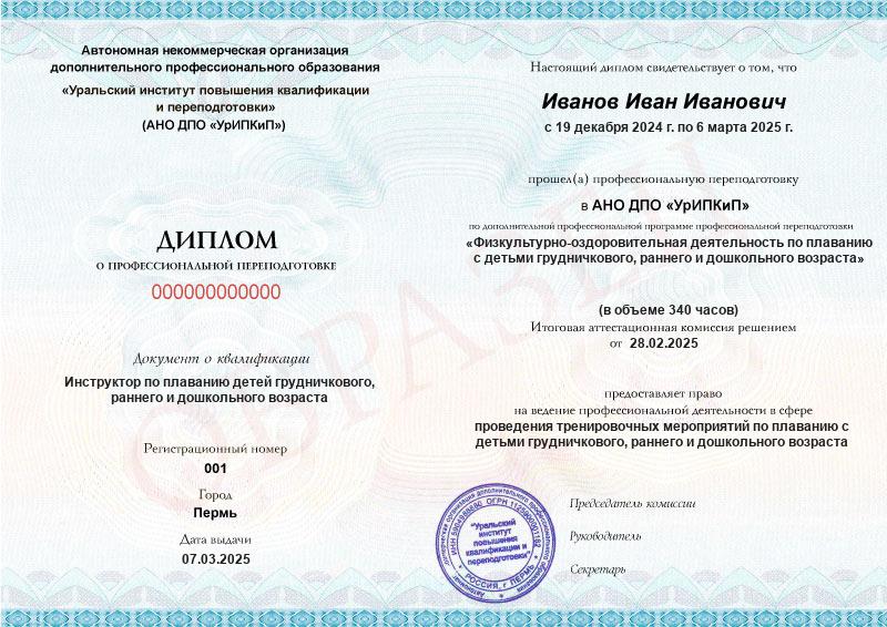 - Квалификация: Инструктор по плаванию детей грудничкового, раннего и дошкольного возраста
