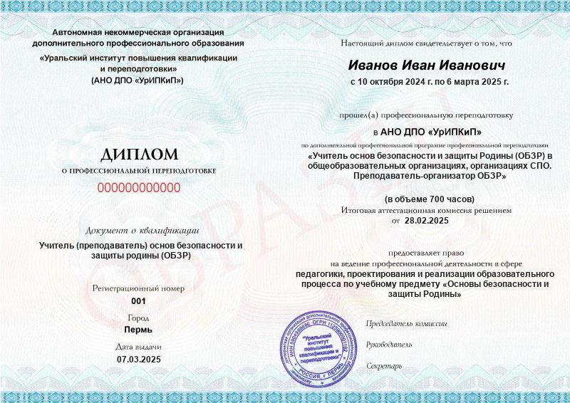 Курс обучения Учитель основ безопасности и защиты Родины (ОБЗР) в общеобразовательных организациях, организациях СПО. Преподаватель-организатор ОБЗР (700ч)