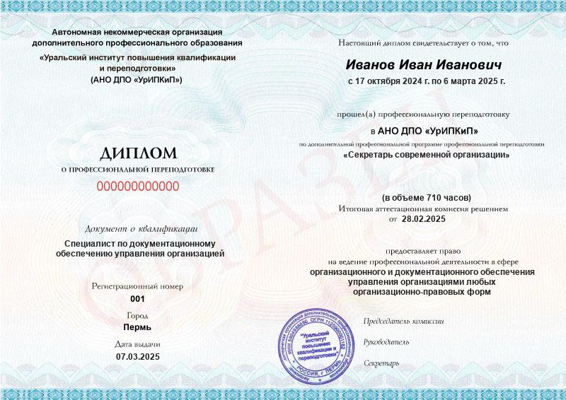 Да, дипломы и удостоверения оформляются в соответствии с действующим законодательством РФ. Документы печатаются на специальных бланках, заверяются печатью АНО ДПО «УрИПКиП».