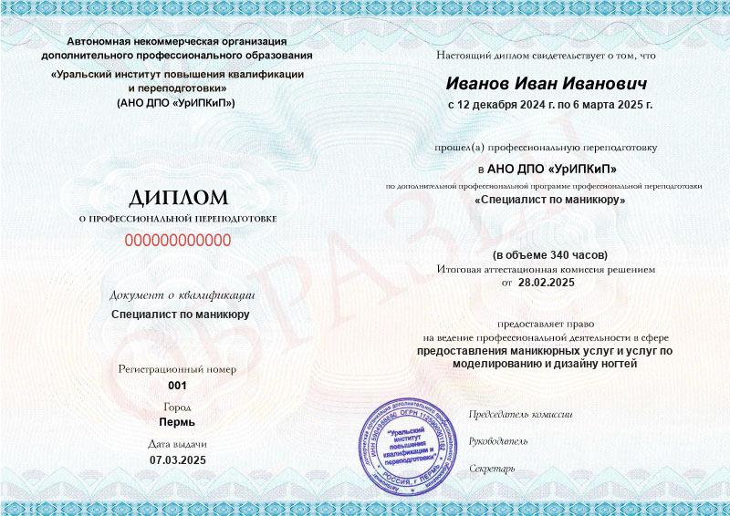 Да, дипломы и удостоверения оформляются в соответствии с действующим законодательством РФ. Документы печатаются на специальных бланках, заверяются печатью АНО ДПО «УрИПКиП».