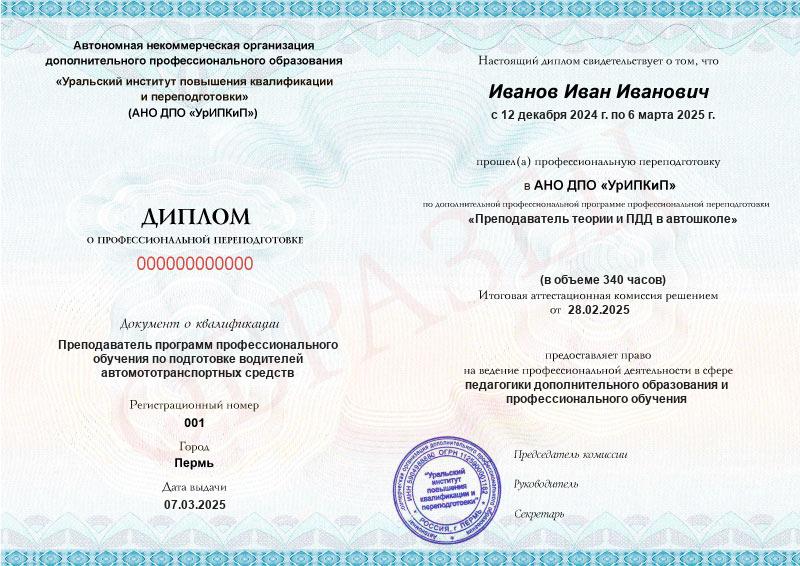 • Квалификация: Преподаватель программ профессионального обучения по подготовке водителей автомототранспортных средств