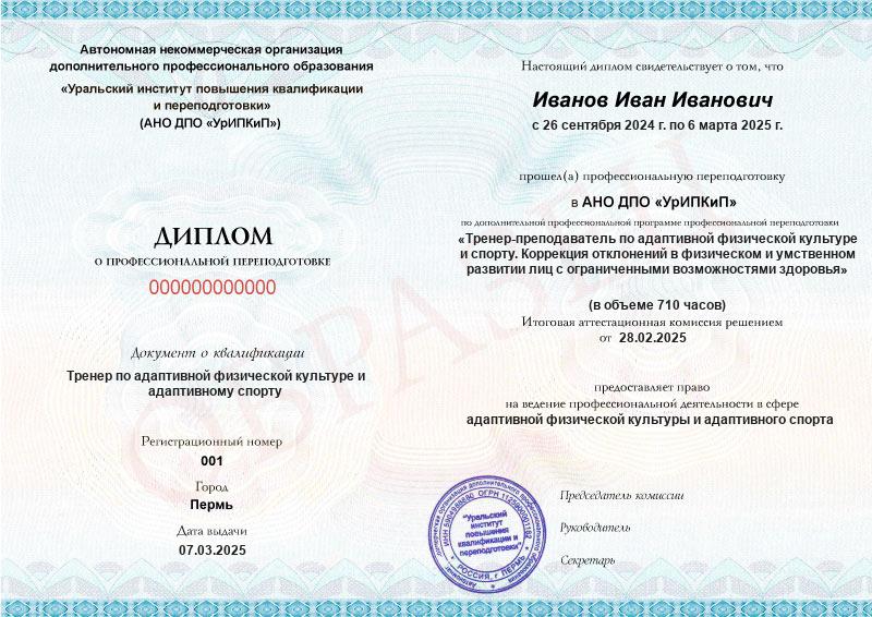 Курс обучения Тренер-преподаватель по адаптивной физической культуре и спорту. Коррекция отклонений в физическом и умственном развитии лиц с ограниченными возможностями здоровья (710ч)