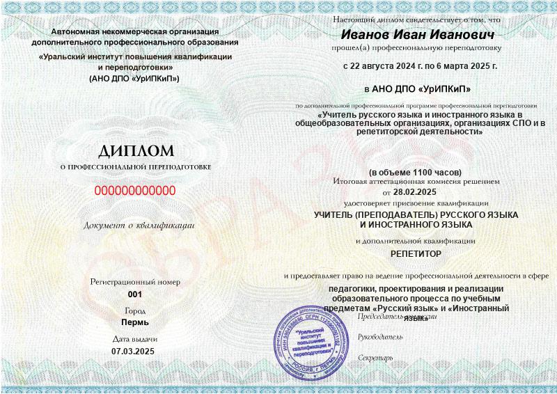• 2 квалификации: Учитель (преподаватель) русского языка и иностранного языка + Репетитор
